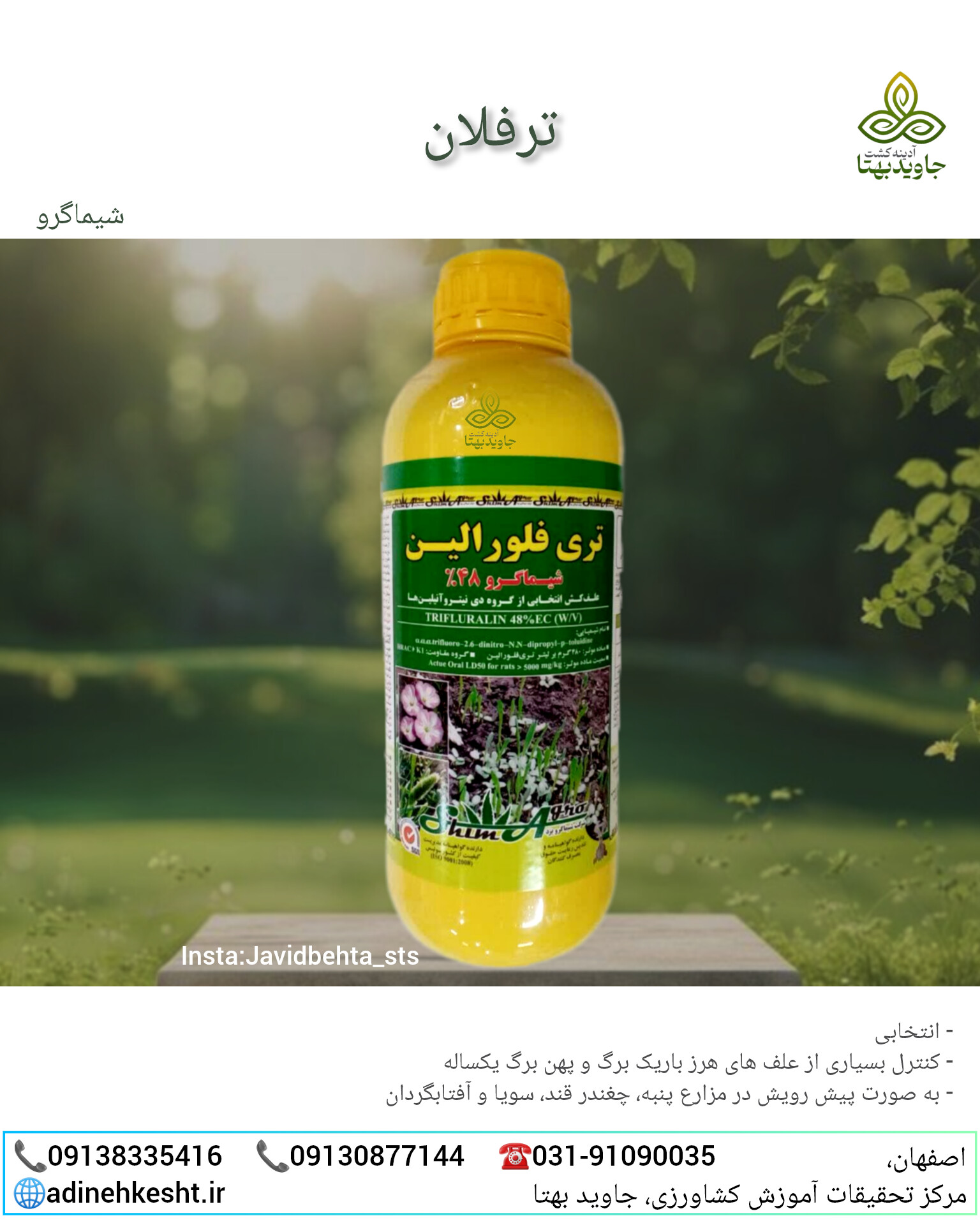 سم تریفلورالین (Trifluralin) با نام تجاری ترفلان (Treflan) یک علفکش پیشکاشت و پیشرویشی از گروه دینیتروآنیلینها (Dinitroanilines) است که بهصورت امولسیون (EC 48%) فرموله میشود. این سم بهطور گسترده برای کنترل علفهای هرز باریکبرگ و پهنبرگ یکساله در محصولات زراعی استفاده میشود.